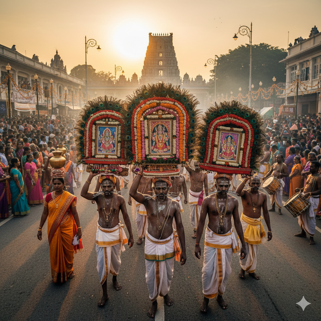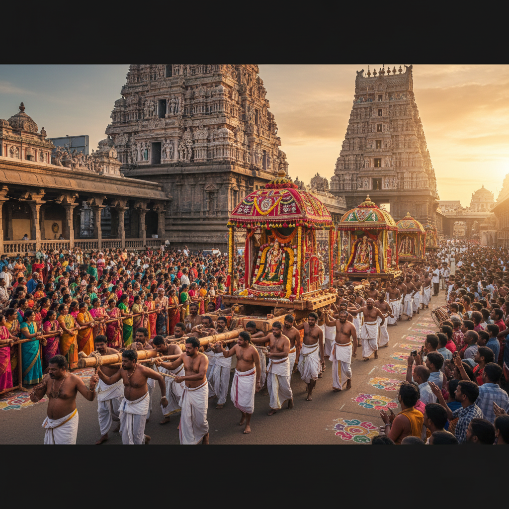 Brahmotsavam is a grand, nine-day annual Hindu festival, primarily celebrated at the Tirumala Venkateswara Temple (Tirupati) in Andhra Pradesh, honouring Lord Venkateswara (Balaji) and believed to have been started by Lord Brahma for the world’s welfare. Key events include ceremonial flag hoisting (Dwajarohanam), processions of deities on various vahanas (vehicles like Garuda, Hamsa), grand rituals like Chakrasnanam, and concluding with Dhwajavarohanam, attracting millions for spiritual blessings and prosperity.Significance & Legend:Brahma’s Festival: The name means “Brahma’s Festival,” as it’s believed Brahma initiated it to thank Lord Venkateswara for protecting humanity.Most Auspicious: Considered the most important festival at Tirumala, ensuring prosperity.Timing: Held annually in the Hindu month of Ashvina (September-October).Key Rituals & Events:Dwajarohanam: Hoisting the Garuda flag on the Dwajasthambham, marking the start.Vahana Sevas: Daily processions with idols of the Lord and consorts on different divine vehicles (Pedda Sesha, Garuda, Hamsa, etc.).Garuda Vahanam: A highlight where the Lord rides the giant Garuda, signifying divinity and Vedas, with immense crowds.Rathotsavam (Chariot Festival): The deity is taken out in a large chariot; witnessing this is believed to prevent rebirth.Chakrasnanam: A holy dip for the deities in the Swami Pushkarini lake on the final day.Dhwajavarohanam: The ceremonial lowering of the flag, concluding the festivities.